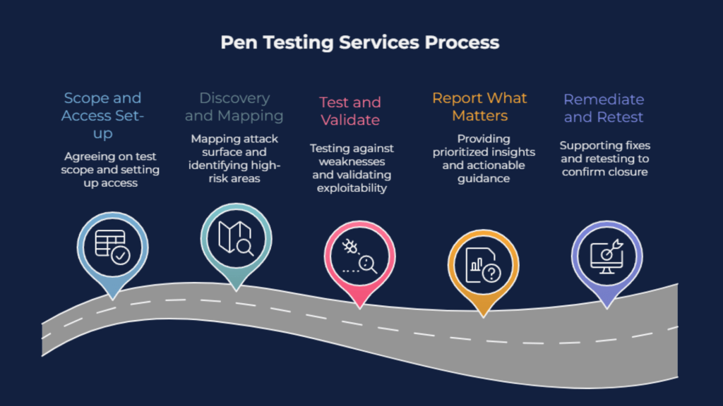 We agree what to test (apps, APIs, cloud services), confirm rules of engagement, and set up the access we need (URLs, test accounts, environments).