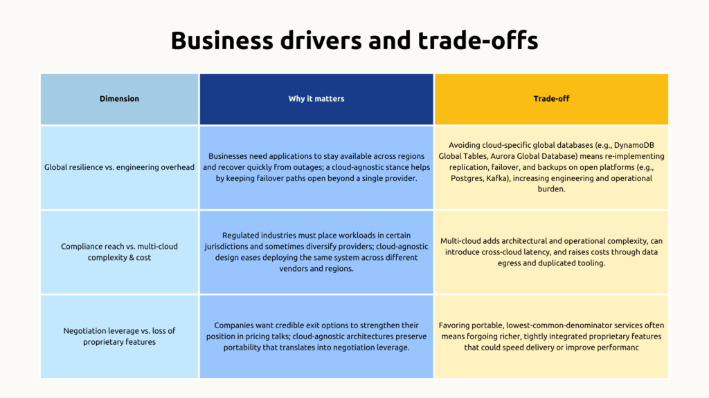 Businesses need applications to stay available across regions and recover quickly from outages; a cloud-agnostic stance helps by keeping failover paths open beyond a single provider