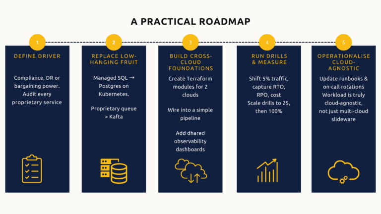 Start with a clear driver (compliance, DR, or bargaining power) and map the path to cloud-agnostic infrastructure. Audit every proprietary service. Replace the lowest-hanging fruit first: managed SQL can become Postgres on Kubernetes; a proprietary queue can become Kafka.